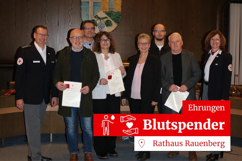 Amtsverwalterin Christiane Hütt-Berger bedankte sich im Rahmen einer Feierstunde im Rathaus bei den anwesenden Spendern: „Sie stehen am Anfang der Kette der Blutversorgung und sind damit zugleich das wichtigste Glied darin. Sie sind damit Lebensretter der unspektakulären Art, sie helfen, ohne den Verletzten jemals zu sehen oder gar zu kennen. Es ist mir und dem DRK-Ortsverein Rauenberg, der die Blutspendeaktionen bei uns organisiert und durchführt, ein Herzensanliegen, Ihr Engagement zu würdigen und Ihnen zu danken.“ In diesem Zusammenhang dankte sie ebenso dem Ortsverein für seinen unermüdlichen Einsatz bei Blutspendeaktionen und bei allen örtlichen Veranstaltungen. „Eine gute Spendenbereitschaft sei für die Zukunft unerlässlich“, so die DRK-Ortsvereinsvorsitzende Stefanie Back, denn alle Prognosen gingen von einem steigenden Bedarf an Blutkonserven aus. Wobei sich die Spendenbereitschaft bei den Rauenberger Blutspendeterminen in den letzten acht Jahren auf jeweils rund 180 Spenden verdoppelt hätte und jeweils rund zehn Prozent neue Erstspender seien. Besonders freut es Frau Back den bekannten Gesichtern im Rahmen der Feierstunde für deren Spendenbereitschaft zu danken. Aufgrund der momentanen Blutknappheit lud Sie die Bevölkerung dringend zur Blutspende am 26. November in die Kulturhalle ein.