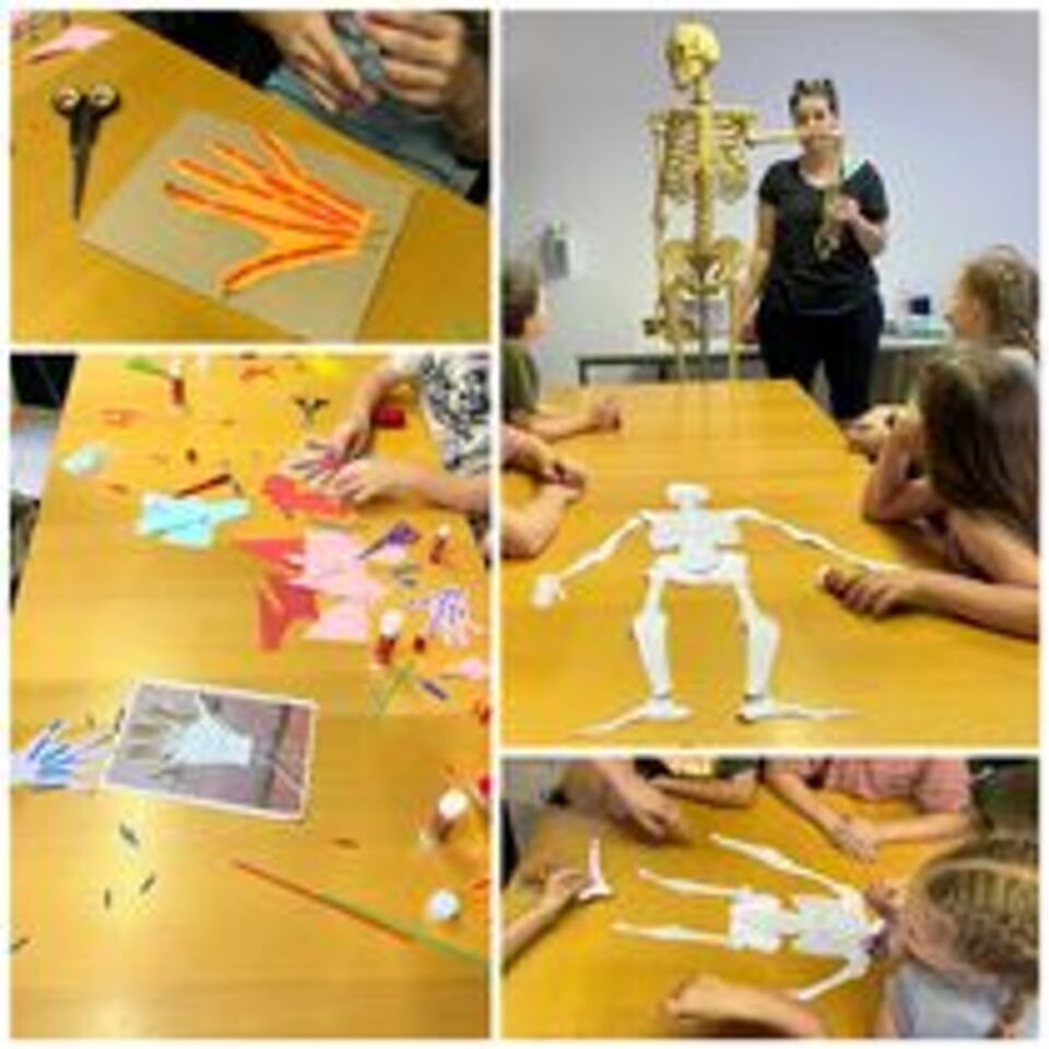 Die Knochen sind starr. Damit wir uns trotzdem bewegen können, haben wir sogenannte Gelenke. Sie verbinden zwei Knochen miteinander. Um dies darzustellen, wurde ein Skelett und eine bewegliche Hand (mit Strohhalm-Knochen) gebastelt. Durch sanftes Ziehen an den Wollfäden können sich die Finger bewegen.